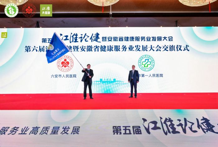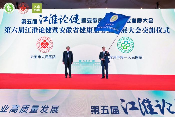 大會(huì)開幕式最后進(jìn)行了第六屆江淮論健暨安徽省健康服務(wù)業(yè)發(fā)展大會(huì)交旗儀式。第五屆江淮論健暨安徽省健康服務(wù)業(yè)發(fā)展大會(huì)承辦單位六安市人民醫(yī)院黨委書記孫良業(yè)和第六屆江淮論健暨安徽省健康服務(wù)業(yè)發(fā)展大會(huì)承辦單位滁州市第一人民醫(yī)院黨委副書記、院長(zhǎng)張文俊上臺(tái)交接會(huì)旗。