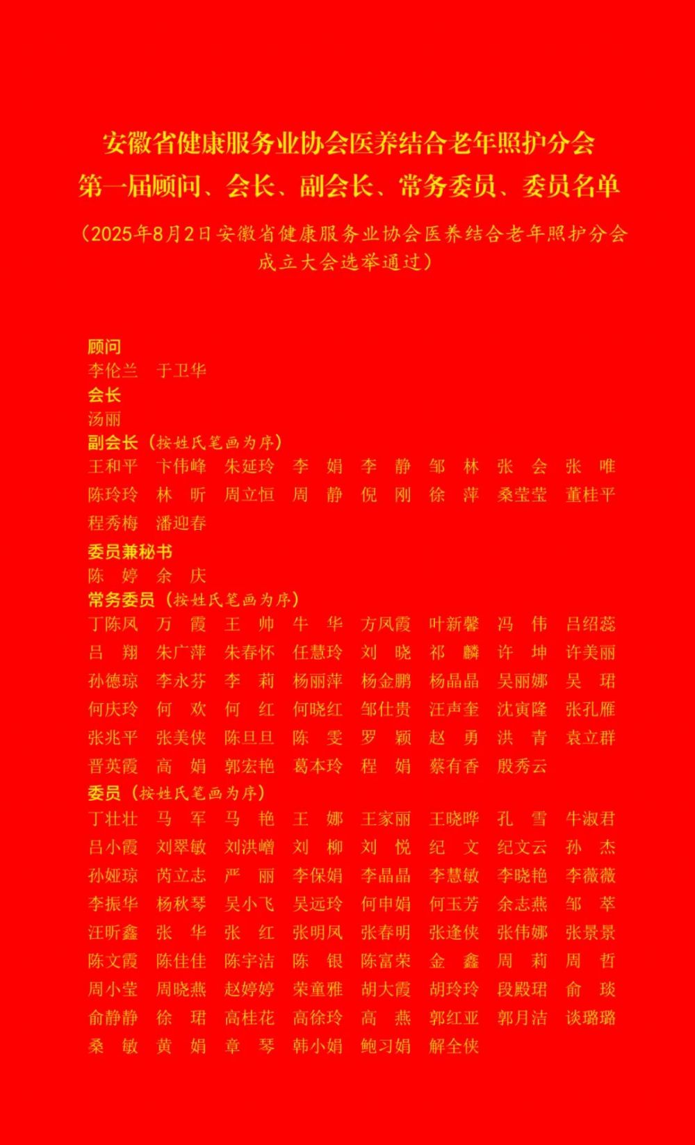 △安徽省健康服務(wù)業(yè)協(xié)會醫(yī)養(yǎng)結(jié)合老年照護分會第一屆顧問、會長、副會長、委員兼秘書、常務(wù)委員、委員名單