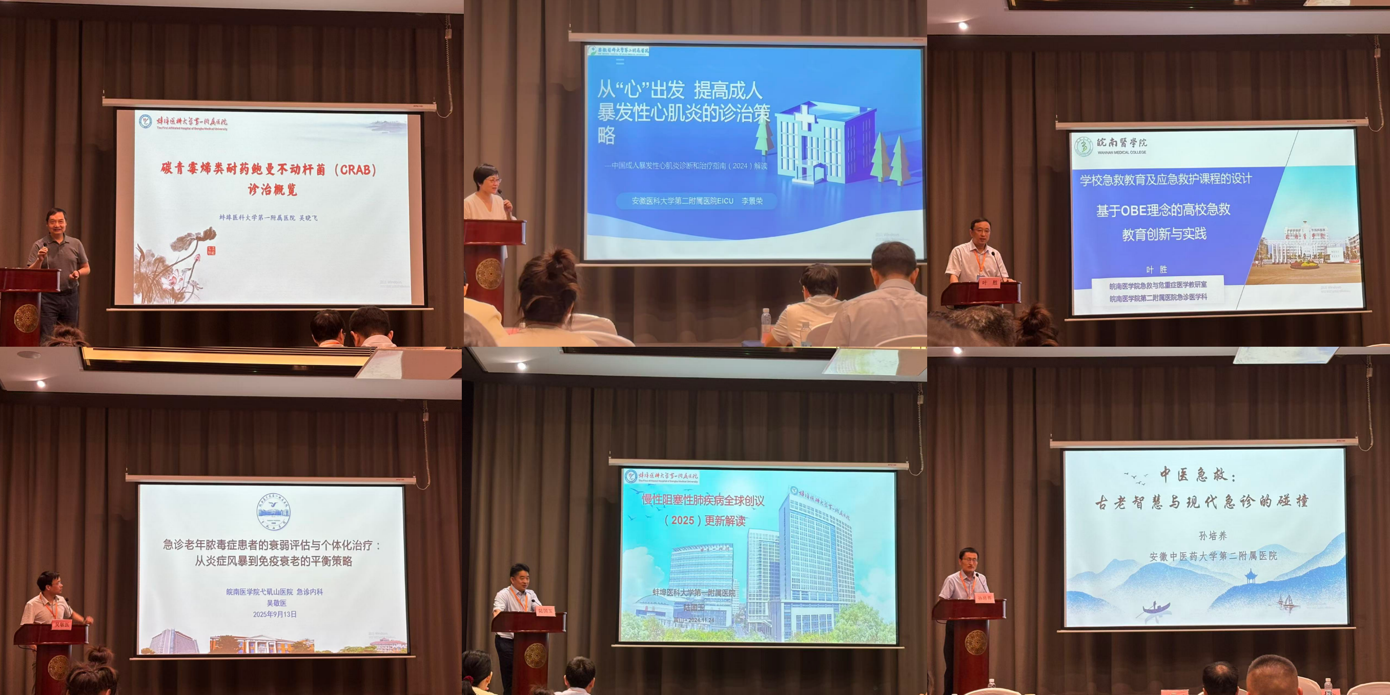 蚌埠醫(yī)科大學(xué)第一附屬醫(yī)院吳曉飛教授以《碳青霉烯類耐藥鮑曼不動桿菌(CRAB)診治概覽》為題,系統(tǒng)梳理了這一多重耐藥菌感染的流行病學(xué)、檢測方法與治療策略。安徽醫(yī)科大學(xué)第二附屬醫(yī)院李景榮教授在《從“心”出發(fā):提高成人暴發(fā)性心肌炎的診治策略》報告中,強調(diào)了早期識別和綜合干預(yù)對挽救患者生命的重要性。皖南醫(yī)學(xué)院第二附屬醫(yī)院葉勝教授分享了《基于災(zāi)難應(yīng)對的急救教育實踐探索》,為大規(guī)模傷亡事件中的醫(yī)學(xué)救援人才培養(yǎng)提供了新思路。皖南醫(yī)學(xué)院附屬弋磯山醫(yī)院吳敬醫(yī)教授在《急診老年膿毒癥患者的衰弱評估與個體化治療》中,深入探討了如何平衡炎癥風暴與免疫衰老,實現(xiàn)精準治療。蚌埠醫(yī)科大學(xué)第一附屬醫(yī)院陸國玉教授對《慢性阻塞性肺疾病全球創(chuàng)議(2025)更新》進行專業(yè)解讀,為慢阻肺急診管理帶來國際新視野。最后,安徽中醫(yī)藥大學(xué)第二附屬醫(yī)院孫培養(yǎng)教授以《中醫(yī)急救:古老智慧與現(xiàn)代急診的碰撞》為題,生動展示了中醫(yī)藥在急癥處理中的獨特理念與應(yīng)用價值。