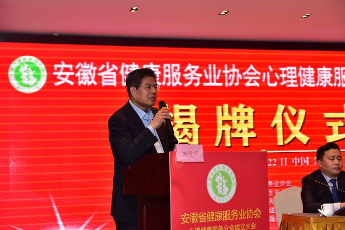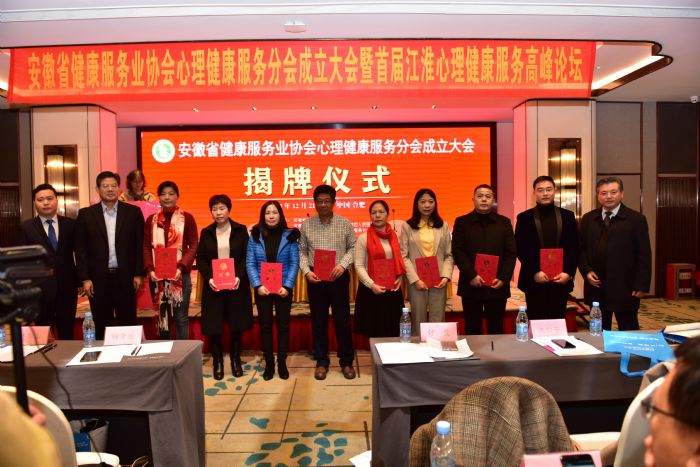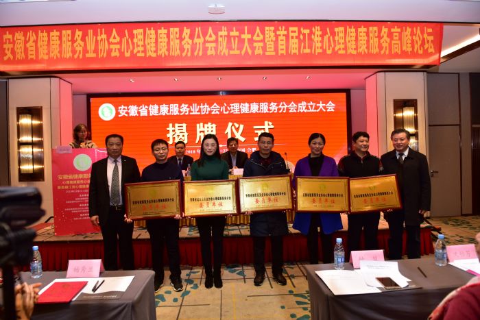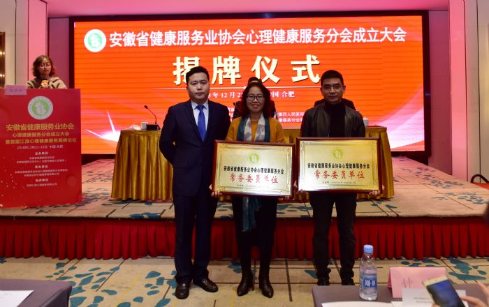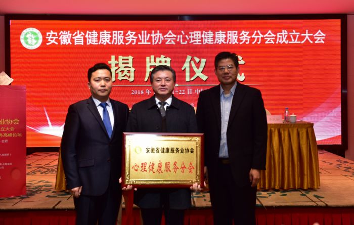 安徽省健康服務業(yè)協(xié)會會長劉愛國和協(xié)會副會長兼秘書長余華伍共同為心理健康服務分會揭牌,并向新當選分會會長李曉駟授牌。分會掛靠安徽省精神衛(wèi)生中心(合肥市第四人民醫(yī)院)。