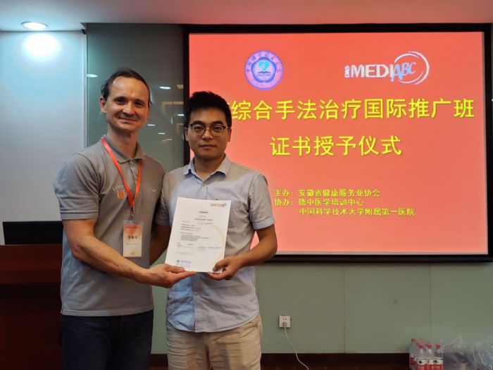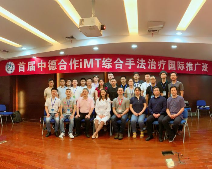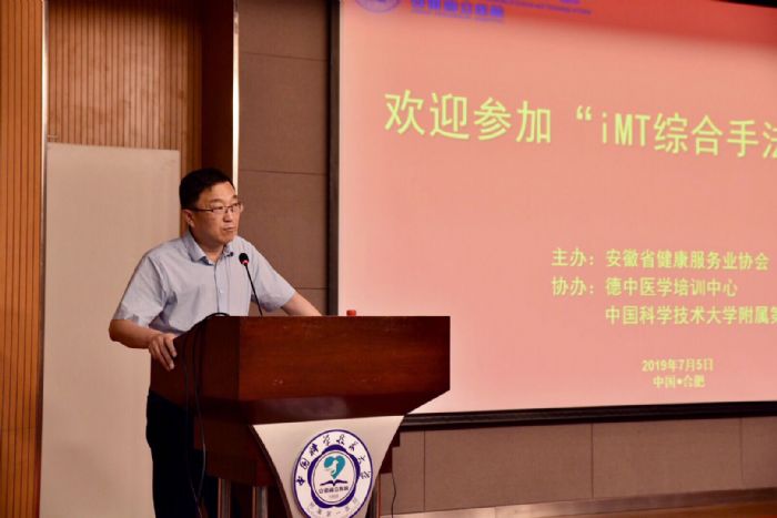 由安徽省健康服務(wù)業(yè)協(xié)會(huì)主辦,德中醫(yī)學(xué)培訓(xùn)中心與中國科學(xué)技術(shù)大學(xué)附屬第一醫(yī)院(安徽省立醫(yī)院)康復(fù)醫(yī)學(xué)科共同承辦的iMT綜合手法治療國際推廣班于2019年7月5日-7日在中國科學(xué)技術(shù)大學(xué)附屬第一醫(yī)院(安徽省立醫(yī)院)南區(qū)學(xué)術(shù)交流中心第三會(huì)議室舉辦,來自省內(nèi)外的24名學(xué)員參加本次學(xué)習(xí)班。本次開班儀式由安徽省健康服務(wù)業(yè)協(xié)會(huì)副秘書長于澍民先生代表主辦方進(jìn)行開班寄語,科大附屬第一醫(yī)院(安徽省立醫(yī)院)南區(qū)副院長周浩泉教授對(duì)來自德國的iMT高級(jí)講師Thomas Brucha先生、德國國家康復(fù)治療師郜志英女士及來自全國各地的學(xué)員致歡迎詞,熱烈的歡迎師生來中科大附一院學(xué)習(xí)國際先進(jìn)的康復(fù)治療新技術(shù)。中科大附一院康復(fù)治療中心吳鳴主任主持。參加開班儀式的特邀嘉賓有德國神經(jīng)康復(fù)協(xié)會(huì)主席Thomas Mokrusch教授、德中醫(yī)學(xué)培訓(xùn)中心主任李巍博士、中科大附一院康復(fù)醫(yī)學(xué)科倪朝民教授。本次學(xué)習(xí)班為我院康復(fù)醫(yī)學(xué)學(xué)術(shù)周活動(dòng)之一。