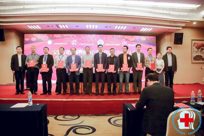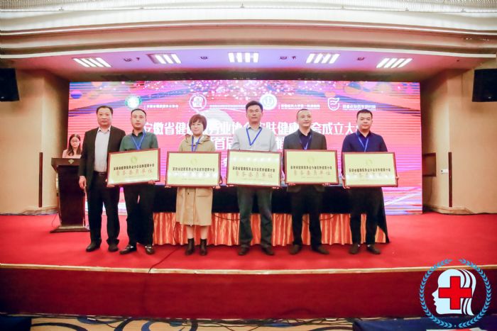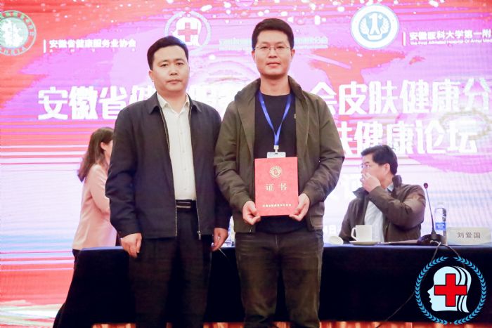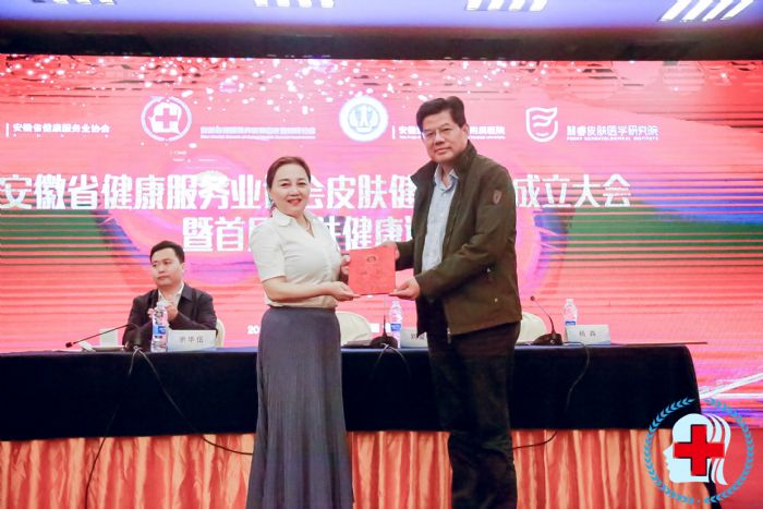 協(xié)會會長劉愛國和協(xié)會副會長兼秘書長余華伍共同為新當選的皮膚健康分會會長楊森教授頒發(fā)“安徽省健康服務業(yè)協(xié)會皮膚健康分會”會牌和會長證書。
