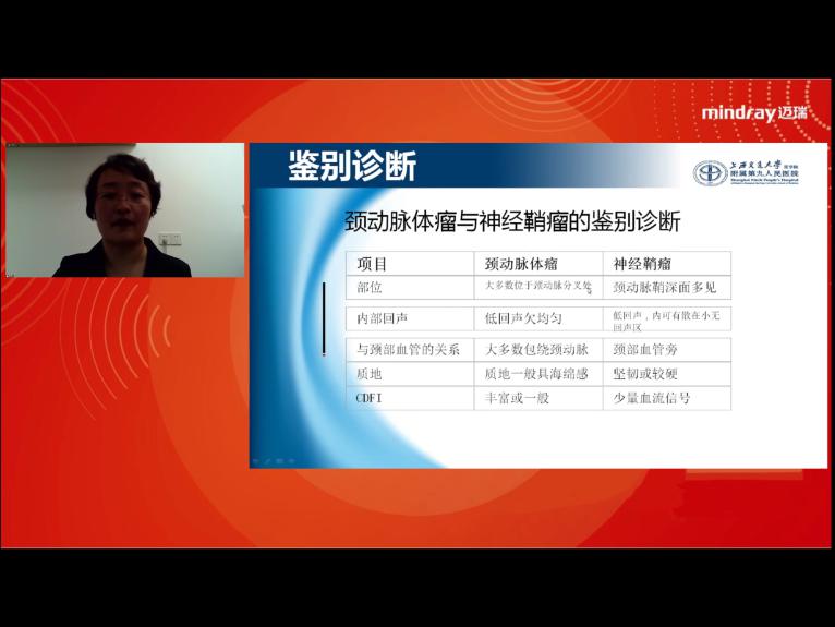 上海交通大學醫(yī)學院附屬第九人民醫(yī)院周輝紅主任講座的題目是《頜面部、頸部囊性和實性包塊的超聲診斷》 。周主任對頜面部及頸部囊性病變做了詳細的介紹,包括涎腺的囊腫、鰓裂囊腫及舌下腺囊腫的分型、實性病變頸動脈體瘤與神經(jīng)鞘瘤的診斷與鑒別診斷。