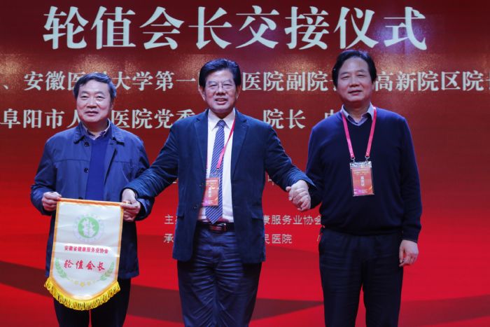 會議中進行了2020年上半年輪值會長交接儀式,協會會長劉愛國教授、上一任輪值會長,安徽醫(yī)科大學第一附屬醫(yī)院副院長兼高新院區(qū)院長孫國平教授、下一任輪值會長,阜陽市人民醫(yī)院黨委書記、院長冉獻貴共同上臺交接。