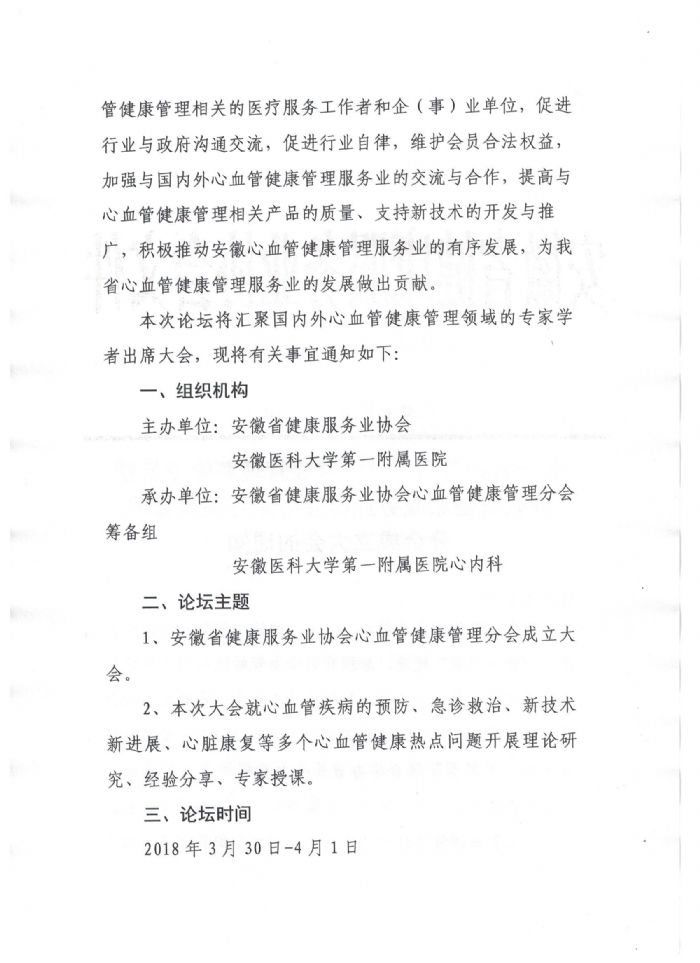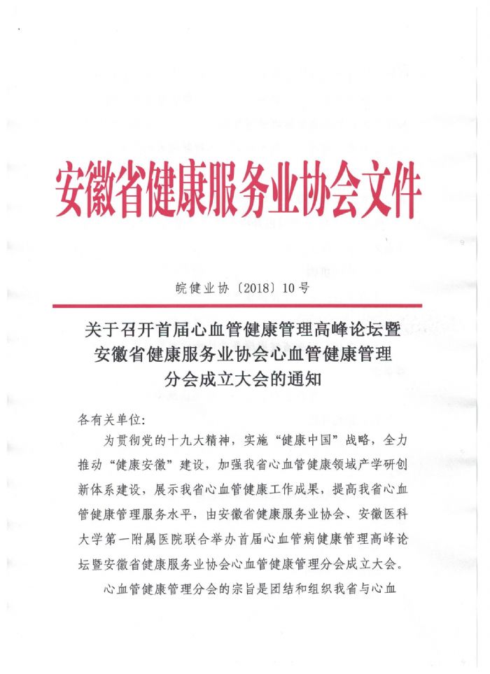 關(guān)于召開首屆心血管健康管理高峰論壇暨安徽省健康服務(wù)業(yè)協(xié)會心血管健康管理分會成立大會的通知