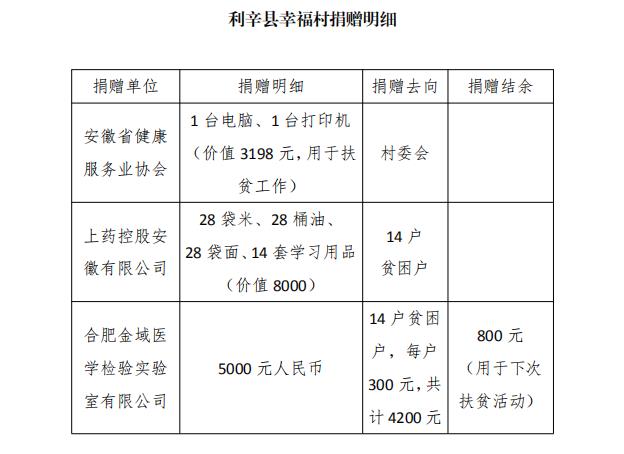 安徽省健康服務(wù)業(yè)協(xié)會(huì)將捐贈(zèng)的物質(zhì)和款項(xiàng),都已及時(shí)用到“百社進(jìn)百村”脫貧攻堅(jiān)工作中,確保捐贈(zèng)資金使用規(guī)范、公開透明、讓捐贈(zèng)單位放心、讓全社會(huì)放心。同時(shí)呼吁各會(huì)員單位等愛心單位積極參與“百社進(jìn)百村”活動(dòng),助力脫貧攻堅(jiān)。