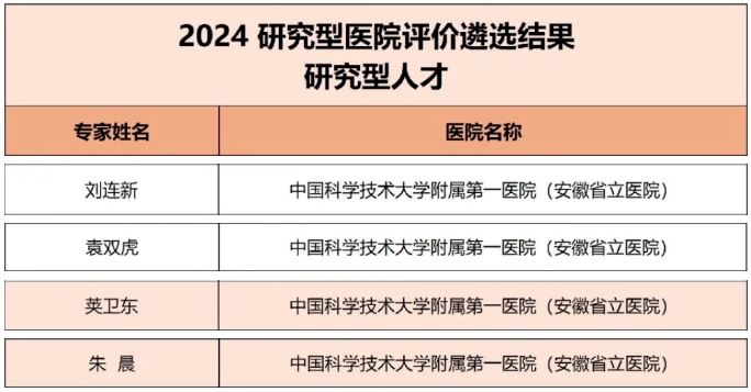 近日,2024研究型醫(yī)院評價(jià)遴選結(jié)果在2024中國研究型醫(yī)院大會上正式發(fā)布。中國科大附一院入選研究型醫(yī)院(綜合醫(yī)院)。神經(jīng)外科、普外科、骨科、血液內(nèi)科、放療科、神經(jīng)內(nèi)科6個(gè)學(xué)科入選研究型學(xué)科名單。劉連新、袁雙虎、莢衛(wèi)東、朱晨4位專家入選研究型人才名單。
