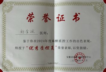 會(huì)上,安徽省麻醉質(zhì)量控制中心授予蚌埠市麻醉質(zhì)控中心“2024年度優(yōu)秀質(zhì)控中心”稱號(hào),同時(shí)授予蚌埠市中心醫(yī)院(蚌埠市第三人民醫(yī)院)麻醉科主治醫(yī)師鮑奎斌“"優(yōu)秀質(zhì)控員”。