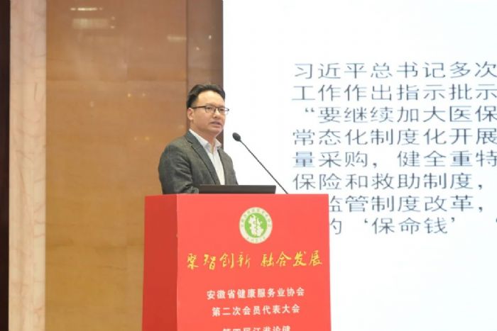 省醫(yī)保局黨組成員、副局長徐翔東發(fā)表講話。他代表省醫(yī)保局對這次大會的成功召開表示熱烈的祝賀并提出:希望安徽省健康服務業(yè)協會擔當有為,做好政府部門的有力助手。協會要充分發(fā)揮好協會組織作用,為安徽醫(yī)保政策當好“參謀”。也希望安徽省健康服務業(yè)協會廣大會員當好醫(yī)保政策的“守門員”,及時了解醫(yī)保政策,服務協會會員。