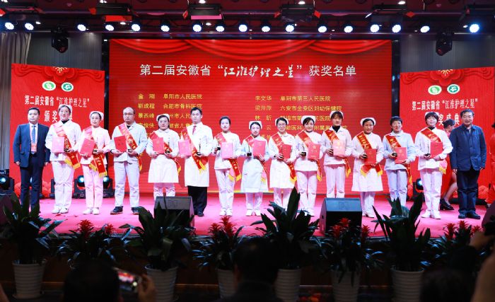 安徽省護(hù)理學(xué)會(huì)副理事長(zhǎng)兼秘書長(zhǎng)李志菊和阜陽(yáng)市人民醫(yī)院副院長(zhǎng)朱振華共同為獲獎(jiǎng)人員頒獎(jiǎng)