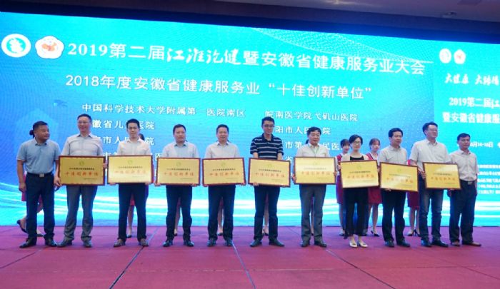 2018年安徽省健康服務(wù)業(yè)“十佳”單位及個人。獲得“十佳創(chuàng)新單位”分別為:中國科學(xué)技術(shù)大學(xué)附屬第一醫(yī)院南區(qū)、皖南醫(yī)學(xué)院弋磯山醫(yī)院、安徽省兒童醫(yī)院、阜陽市人民醫(yī)院、六安市人民醫(yī)院、滁州市第一人民醫(yī)院、蚌埠市第三人民醫(yī)院、安徽省皖南康復(fù)醫(yī)院、阜陽市第五人民醫(yī)院、壽縣中醫(yī)醫(yī)院。獲得“十佳創(chuàng)新人物”分別為:安徽華源醫(yī)藥股份有限公司王軍、霍邱縣第二人民醫(yī)院朱文章、利辛縣中醫(yī)院劉勇、皖南醫(yī)學(xué)院附屬第二附屬醫(yī)院劉冰瑩、安徽醫(yī)科大學(xué)第一附屬醫(yī)院孫國平、阜陽市婦女兒童醫(yī)院李忠民、安徽海豚健康管理有限公司胡興龍、蚌埠醫(yī)學(xué)院第一附屬醫(yī)院魯正、懷遠縣人民醫(yī)院褚永光、太和縣中醫(yī)院顏鵬飛。獲得 “十佳健康衛(wèi)士”分別為:合肥金域醫(yī)學(xué)檢驗實驗室有限公司申夢來、安徽省第二人民醫(yī)院吳昭芹、蕪湖市第二人民醫(yī)院張靜、合肥市第四人民醫(yī)院張許來、廬江縣中醫(yī)院陳明、臨泉縣中醫(yī)院鄭漢軍、阜陽市第二人民醫(yī)院韓明鋒、滁州市中西醫(yī)結(jié)合醫(yī)院童宗培、安徽濟民腫瘤醫(yī)院滿祎、中國科學(xué)技術(shù)大學(xué)附屬第一醫(yī)院褚俊。